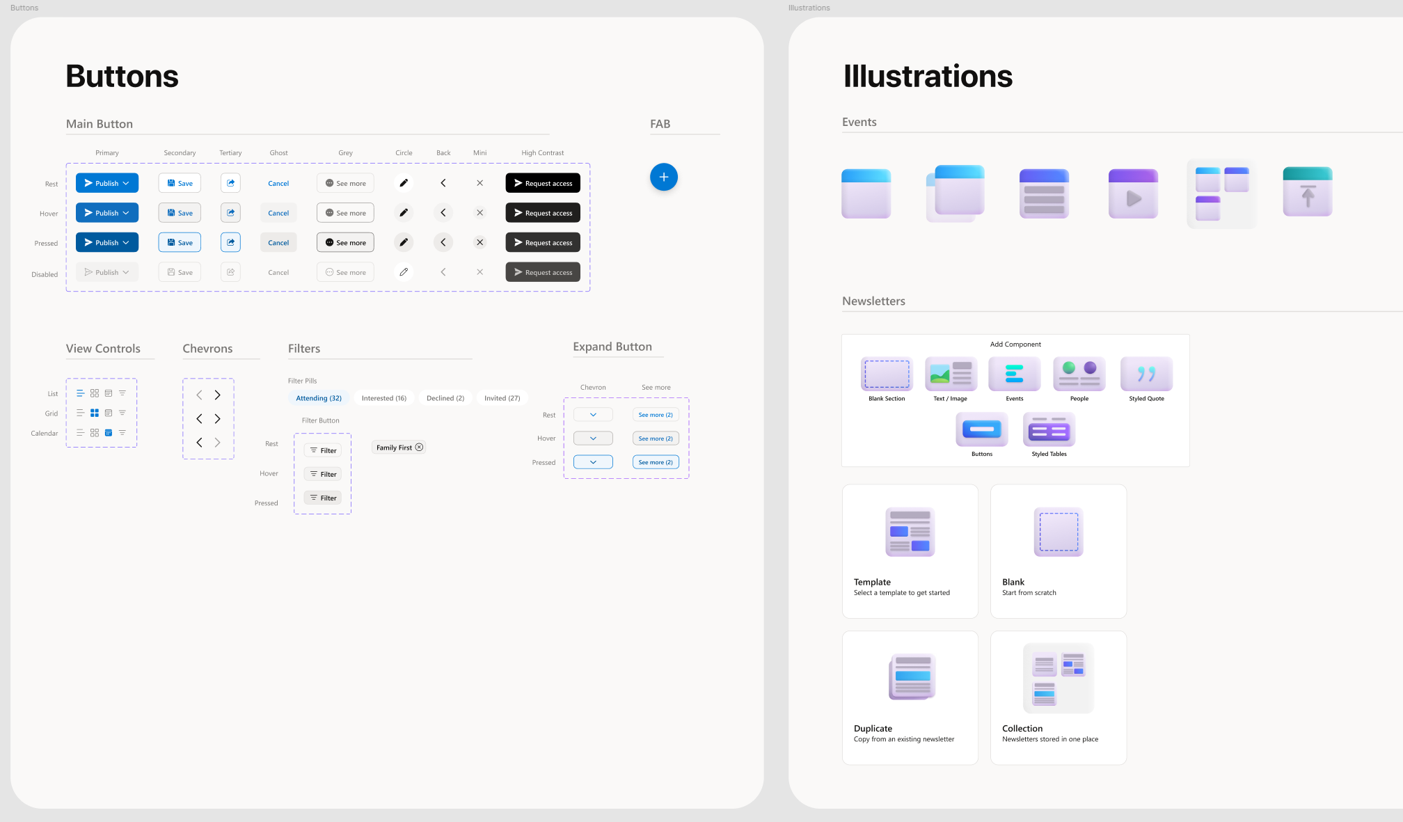 While managing the Outlook Accelerator team, I drove the creation of a design system that provided a foundation for each of the projects. There was a delicate balance between respecting the overall Fluent design system as defined by Microsoft and pushing the boundaries a bit on our UI components. Our goal was to create products that felt a bit more modern than some of our users expected, while still being cohesive with the overall suite of products. What this meant was slightly increasing corner radii, introducing some more color where possible, increasing some padding and margins for more breathing room, and incorporating some more delightful animations for common interactions.